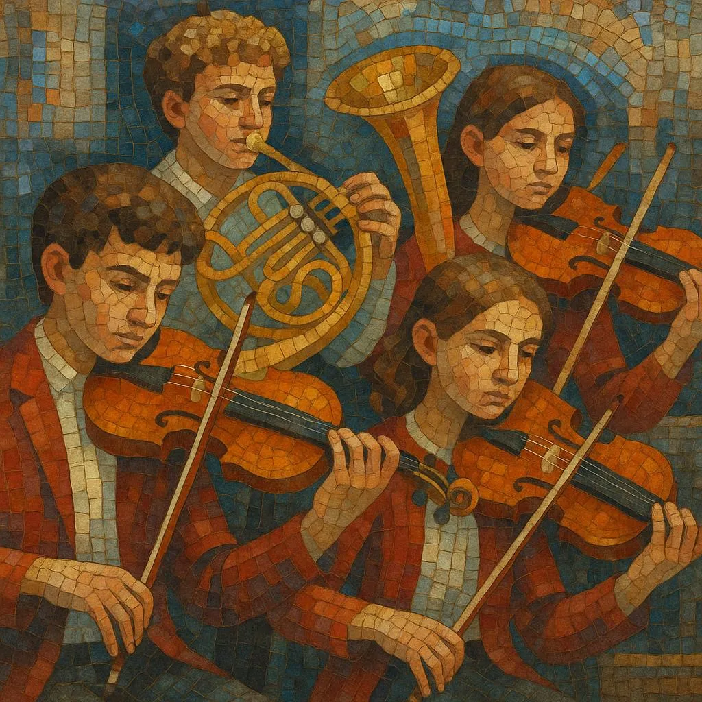 Youth orchestra refers to a full symphony orchestra composed primarily of young musicians (often ages 12–26) who rehearse and perform standard orchestral repertoire alongside contemporary works under professional coaching.